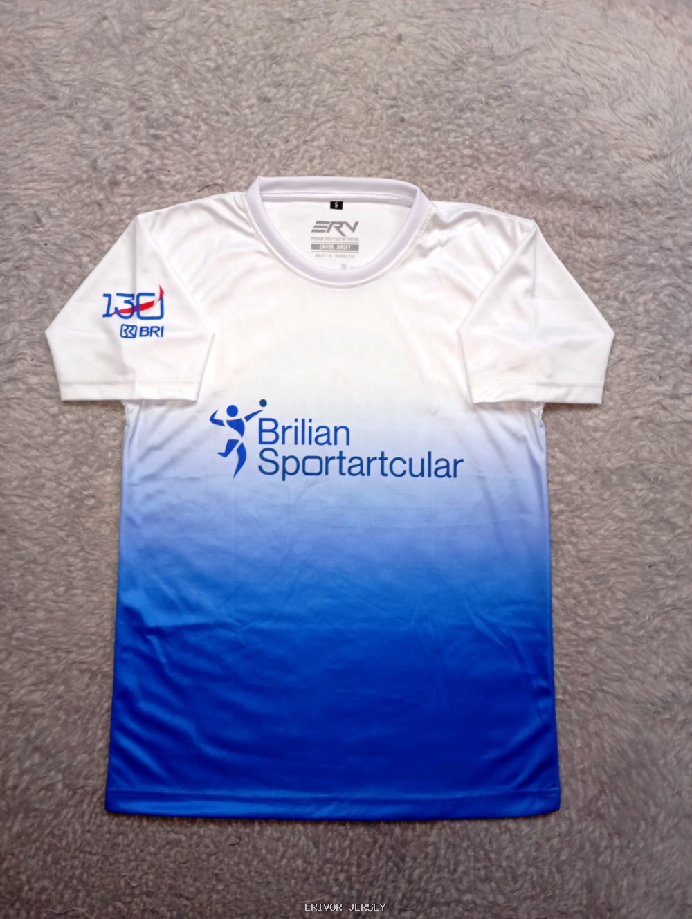 Desain jersey olahraga dengan gradasi warna biru yang elegan, menampilkan logo BRI dan sponsor 'Brilian Sportartcular'.
